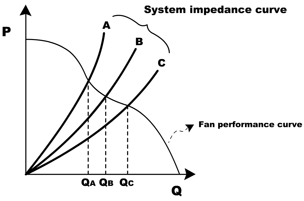 若畫成風壓與風量的關系圖,其曲線為拋物線,稱作風阻曲線(如下圖所示),由于風壓和風量有這種拋物線形的關系,只要得到一組系統的風壓風量值,便可得到整條的系統風阻曲線。